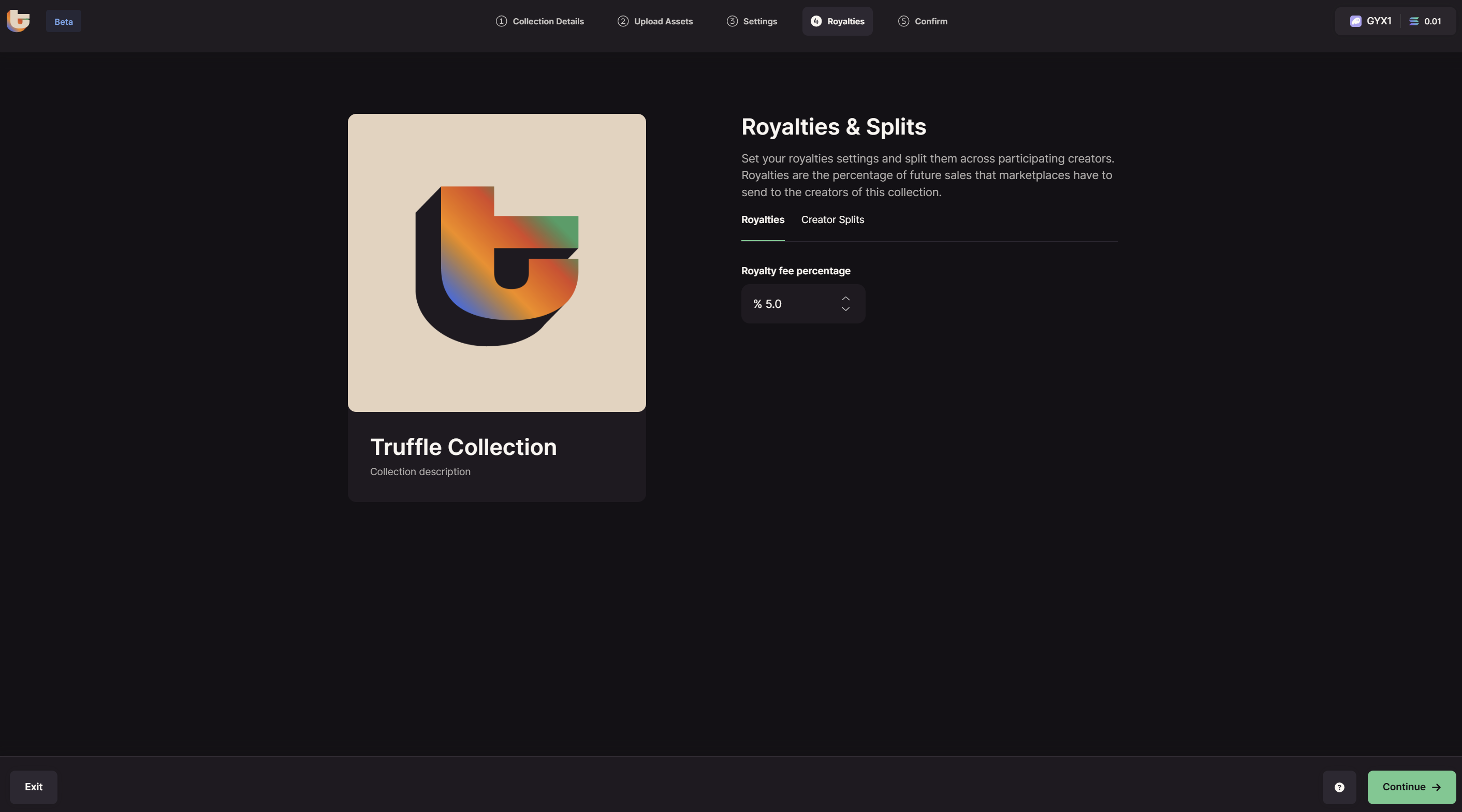 You can split the secondary sale royalties with up to 10 wallets. By default, your wallet will be chosen as the update authority and allocated 100% of the royalties. Here you have several options: