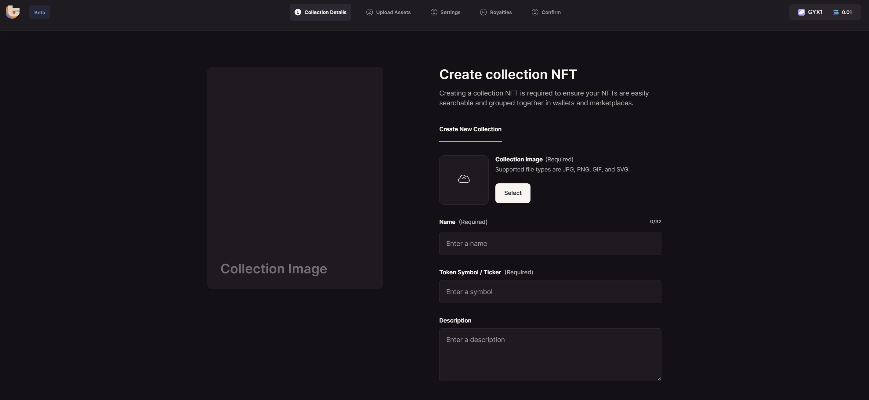 Input the Image, Name, and Description that will be used for both the token and NFT collection metadata. Token Symbol / Ticker will only be used on the token