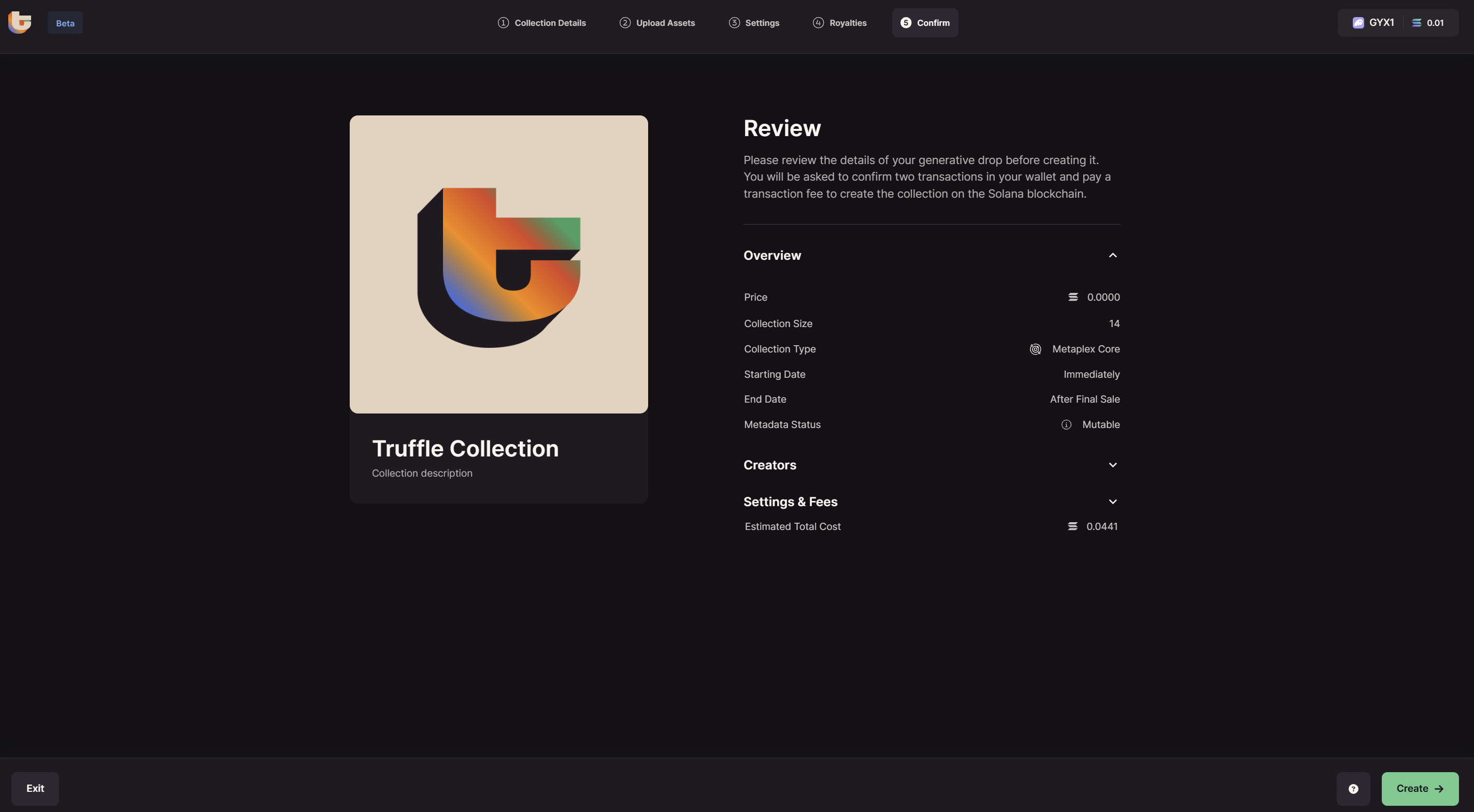 Once you are on this step, check all the details of your Hybrid Drop and click `Create`to publish your Hybrid Drop. A modal will then appear with the steps of the actions that need to happen. You will have a couple of transactions to approve during this process. Please monitor your wallet and approve transactions as they come in.