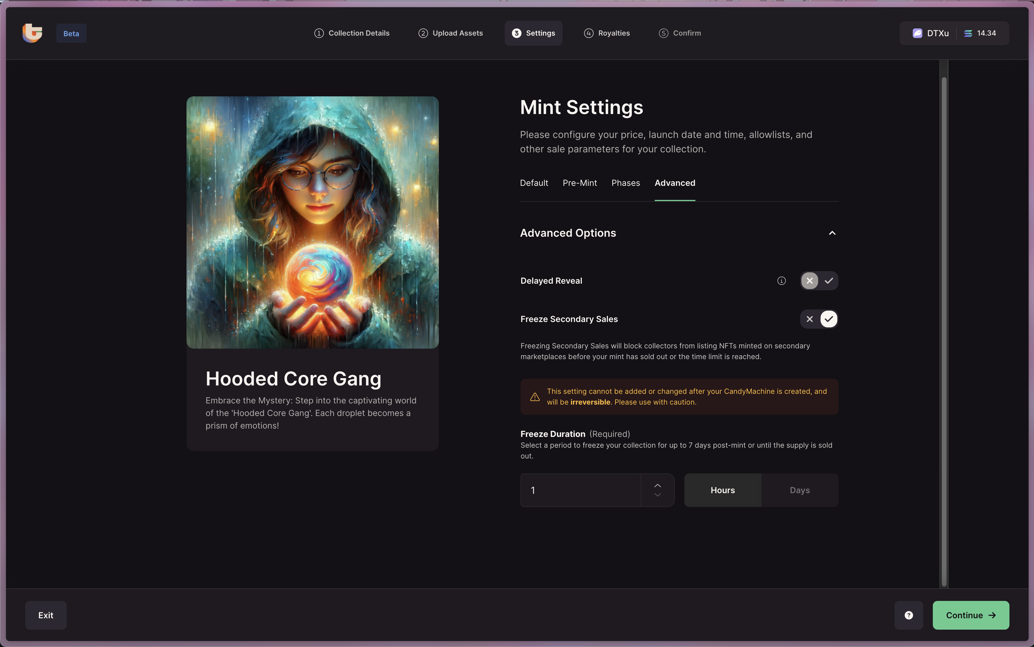 You can Freeze any transfers or sales of the NFT in your Collection for a while during the Mint. The freeze will last until the Collection is sold out or the freeze period is over, whichever comes first. This is useful if you want to ensure that the NFTs are not sold on the secondary during the minting of the Collection. You'll need to provide the following details:
